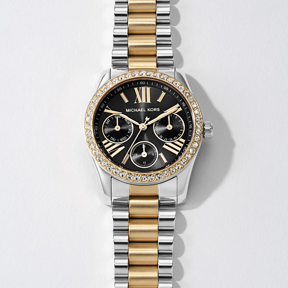 The Michael Kors Lexington MK4925 is a sleek and sophisticated timepiece that blends modern design with timeless appeal. Featuring a polished silver-tone stainless steel case and a dazzling crystal-set bezel, this watch is both elegant and eye-catching. The black dial is accented with multi-function sub-dials for added utility, while the two-tone gold and silver bracelet brings a refined, versatile finish.