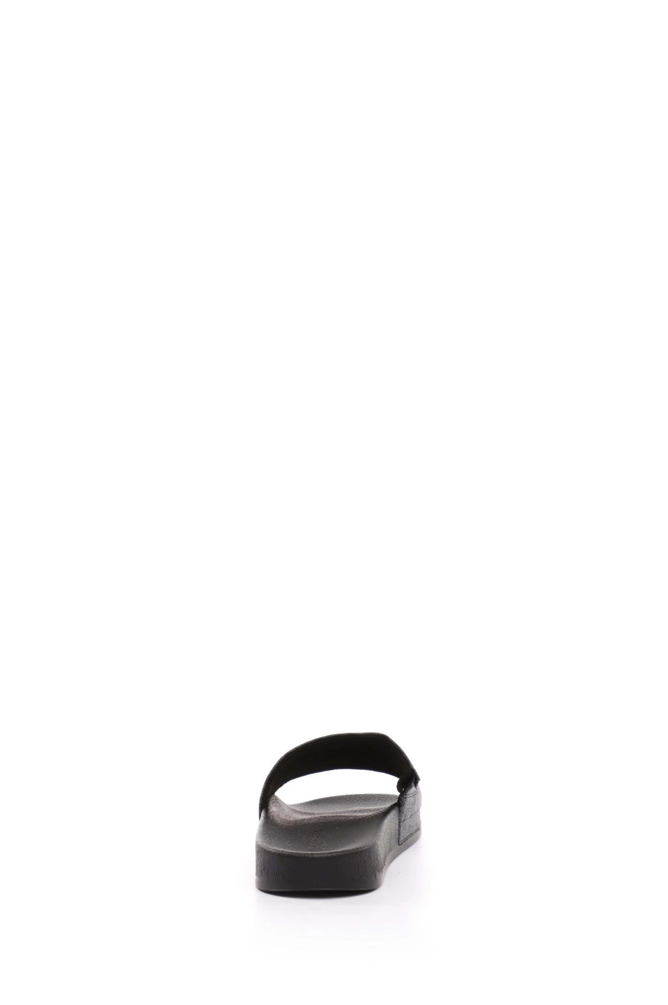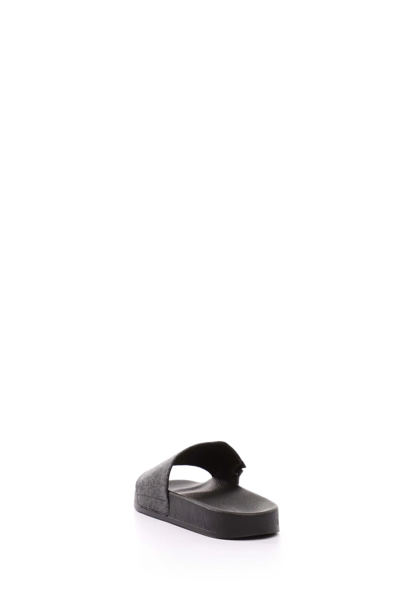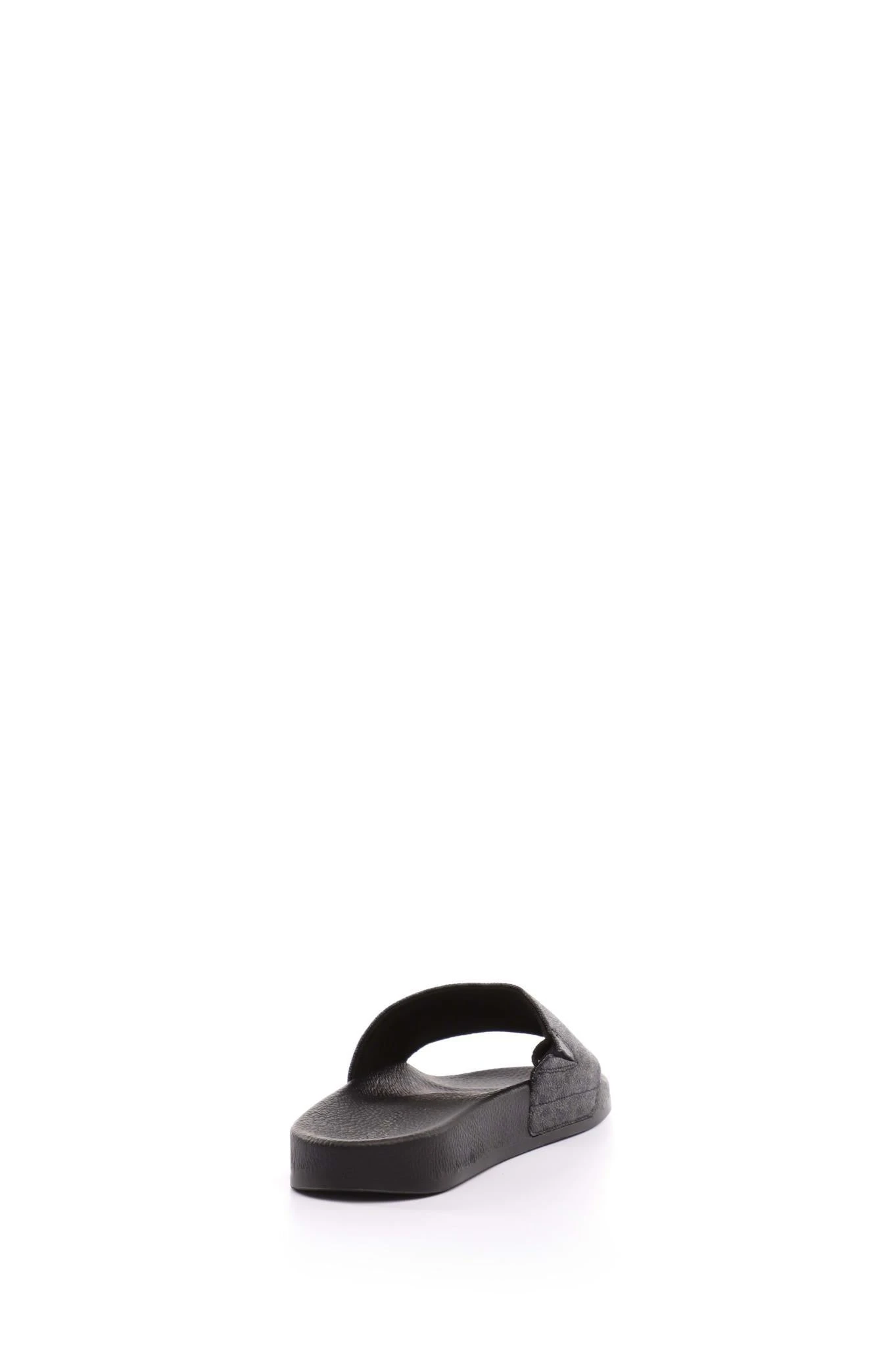 Entièrement noire, elle se distingue par son bandeau texturé à motif monogramme discret et sa semelle moulée qui épouse parfaitement la forme du pied.