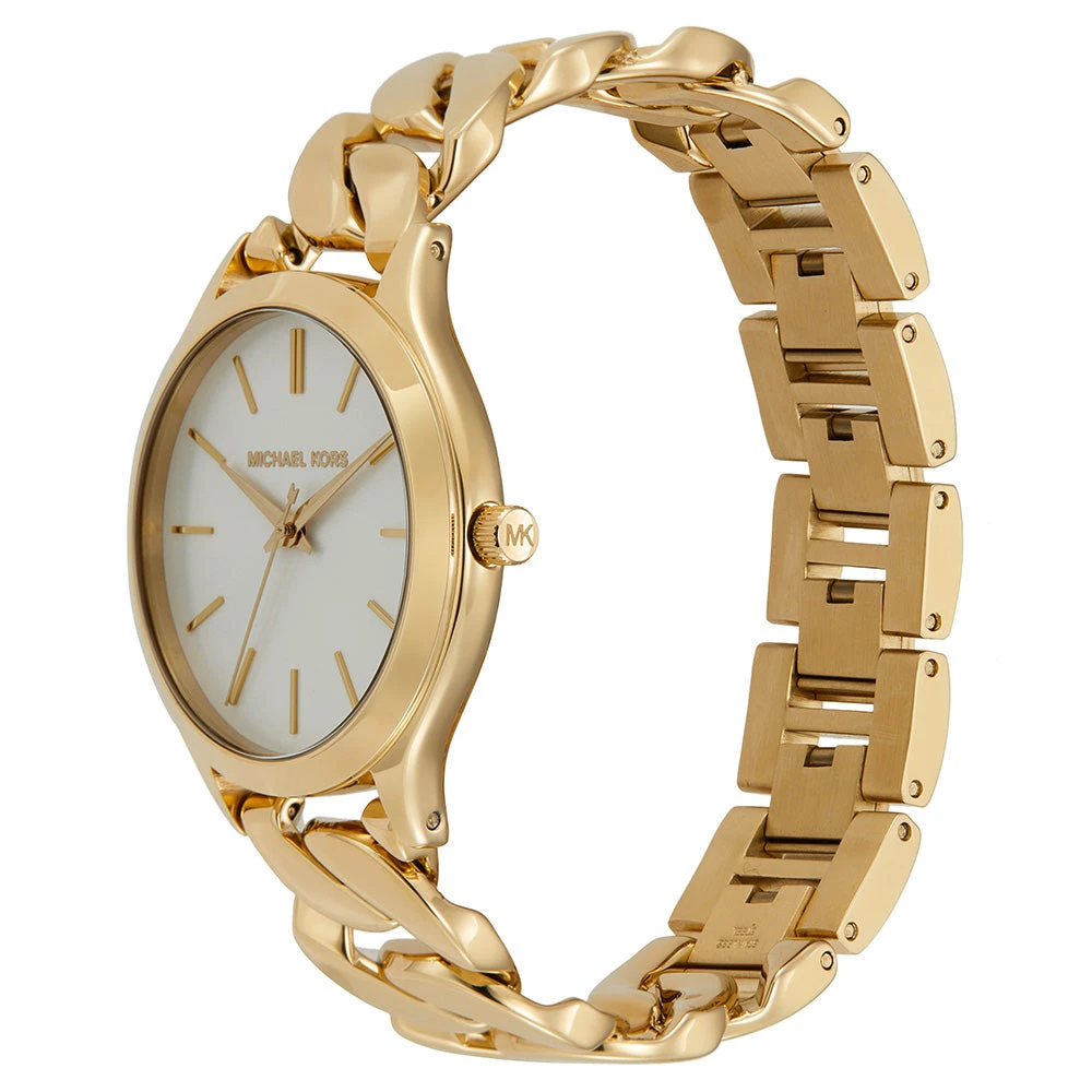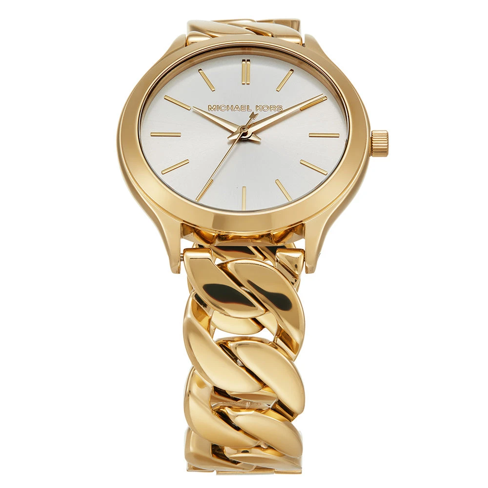 The Michael Kors MK7472 Slim Runway watch embodies sleek sophistication and timeless style. Featuring a gold stainless steel case and matching bracelet, it exudes elegance suitable for any occasion. The silver dial complements the gold tones beautifully, offering a classic and refined aesthetic. With quartz movement ensuring precise timekeeping, the 38mm case size and 18mm strap width provide a comfortable and balanced fit on the wrist. Protected by a durable mineral crystal, this watch is water-resistant up to 50 meters, adding practicality to its luxurious appeal. Whether worn daily or for special occasions, the MK7472 Slim Runway is a statement of effortless elegance and sophistication.